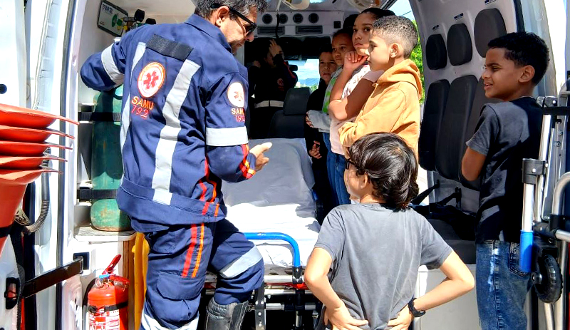 A primeira atividade foi realizada na Escola Municipal Vereador Eudilton Miranda, onde estudantes tiveram a oportunidade de conhecer de perto o funcionamento do serviço de urgência e emergência. A ação proporcionou um momento de aprendizado, interação e conscientização, com orientações sobre quando acionar o SAMU, além de noções básicas de primeiros socorros e apresentação dos equipamentos utilizados nas ambulâncias.