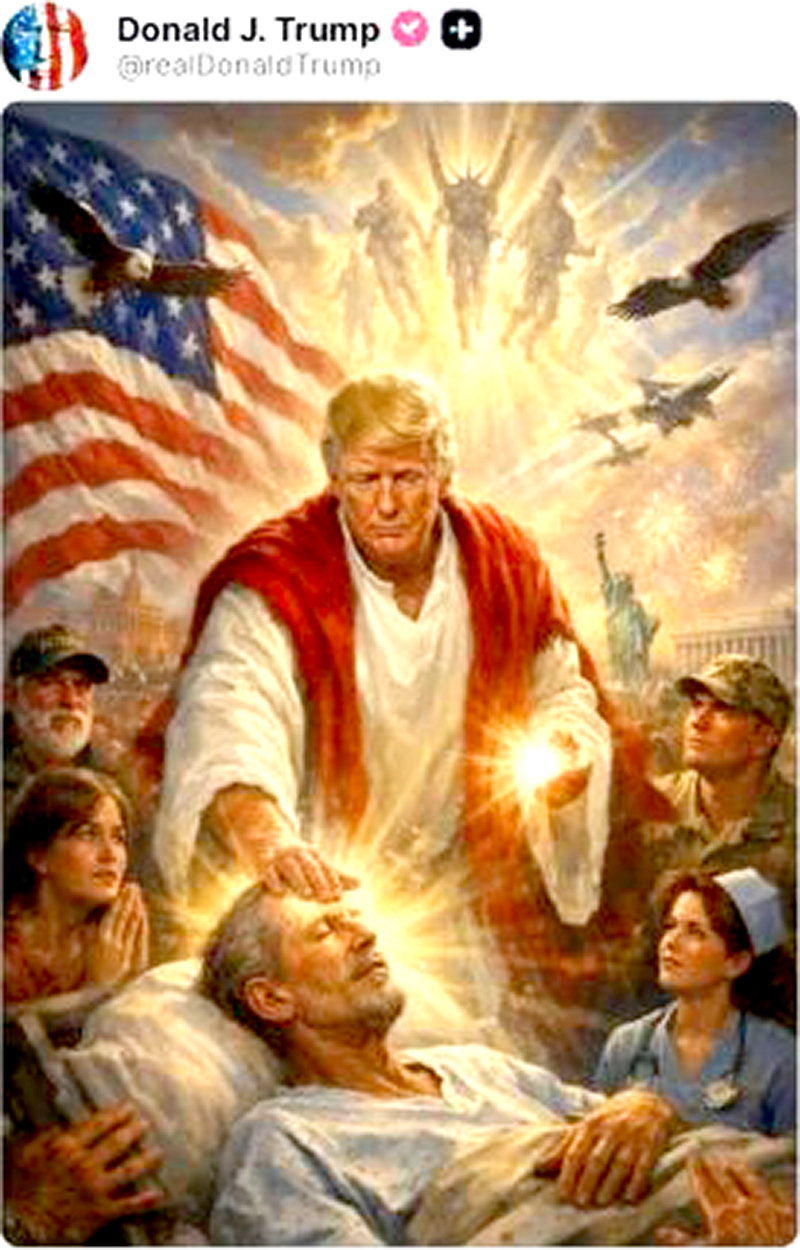 Na imagem postada em plataforma de sua propriedade, a Truth Social, Trump é retratado com uma túnica vermelha e branca, com a mão na testa de uma pessoa, que estaria sendo curada. Alguns soldados aparecem flutuando no céu como anjos, ao lado de águias e de aviões de guerra. Também é possível ver uma criança rezando, uma enfermeira, a bandeira dos Estados Unidos e a Estátua da Liberdade.