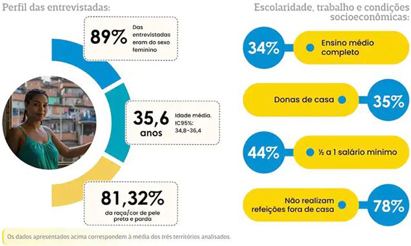 O perfil das famílias entrevistadas reforça a vulnerabilidade social: 89% dos responsáveis pela alimentação são mulheres, majoritariamente negras, e os domicílios têm, em média, quatro pessoas.