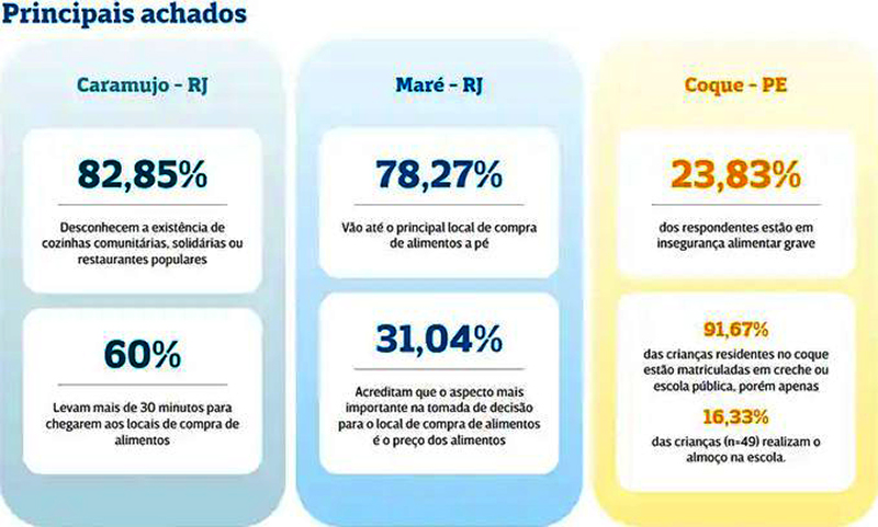 Já no Caramujo, também no estado do Rio, o estudo identificou dificuldades no abastecimento alimentar. “Cerca de 60% dos respondentes levam mais de 30 minutos para chegar aos locais de compra. Esse dado alerta para a fragilidade do acesso físico aos alimentos e reforça a necessidade de ações que garantam disponibilidade e qualidade alimentar nesses territórios”, disse Rangel.