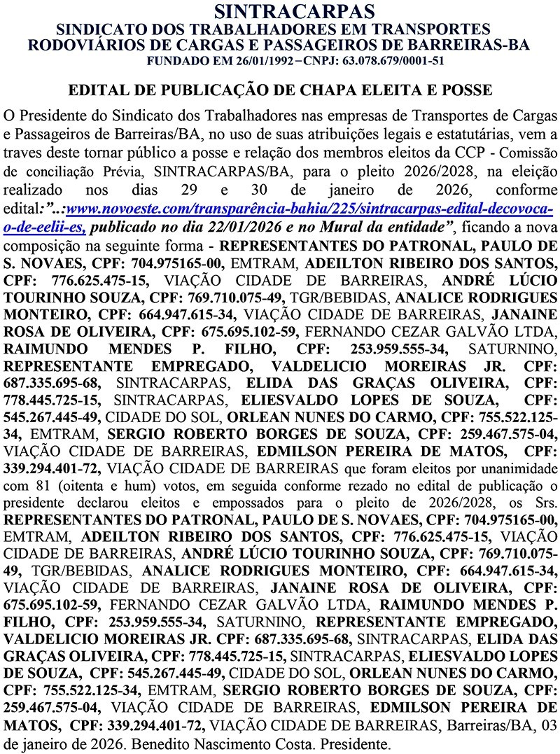 SINTRACARPAS_EDITAL DE PUBLICAÇÃO DE CHAPA ELEITA E POSSE