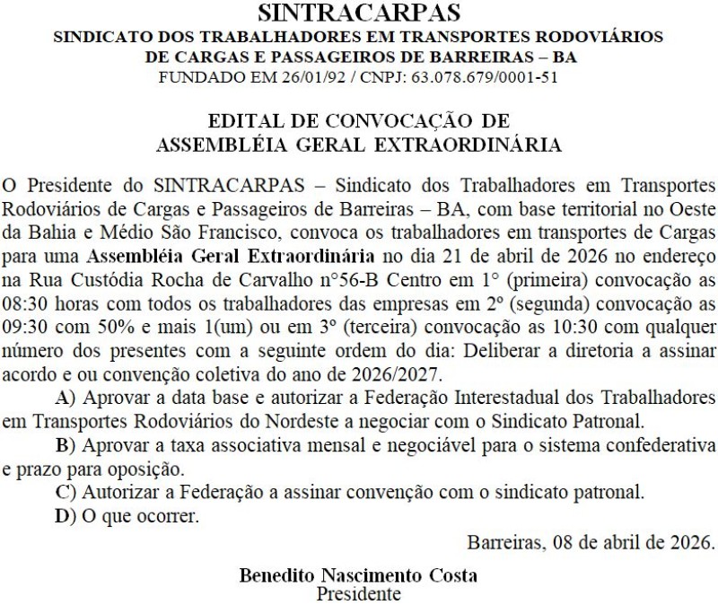 SINTRACARPAS - EDITAL DE CONVOCAÇÃO DE ASSEMBLEIA GERAL EXTRAORDINÁRIA_EMPRESAS DE CARGAS 2026